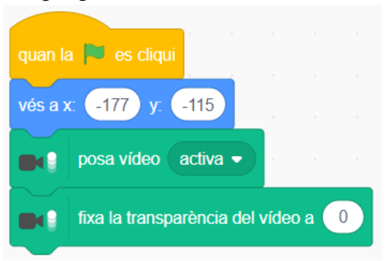 Pas 12. Afegir el bloc que permet activar la webcam a la part final de la programació que s’ha fet al pas 10 d’aquesta secció. A més, es fixarà la transparència del vídeo a 0. Això farà que la imatge sigui nítida.