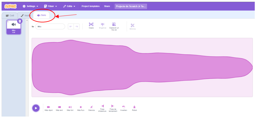 Pas 16. Per facilitar la comprensió, es pot enregistrar de veu aquest mateix missatge. Anar a la pestanya “sons” per obrir l’editor.