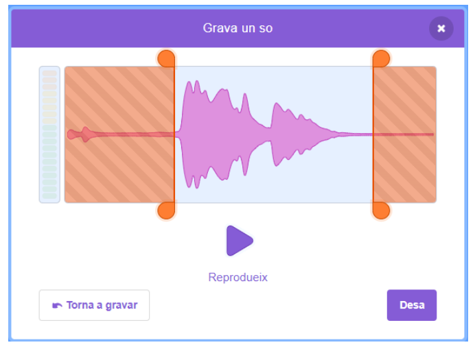 Pas 19. Enregistrar el so i ajustar el començament i el final desplaçant els punts que el delimiten. A continuació desar el so.
