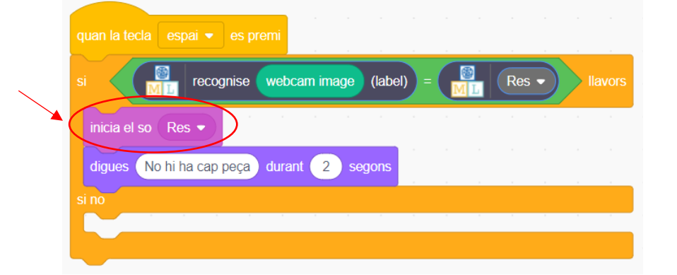 Pas 21. Tornar a la pestanya “Codi” i afegir el bloc del so a la programació que ja existeix.