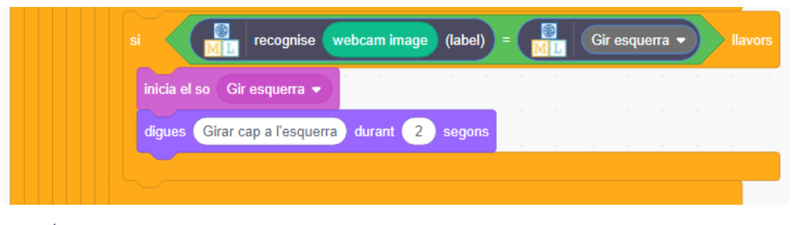 Pas 23. Un cop s’han fet els condicionals de les classes “Res”, “Inici”, “Atura”, “Dreta”, “Esquerra”, “Amunt”, “Avall” i “Gir dreta”, quedarà un espai a la secció “Si no…” de l’últim bloc condicional. En aquest espai s’hi afegiran les accions per identificar l’última classe que queda (“Gir esquerra”). Ara bé, al ser l’última, s’utilitzarà un condicional simple.