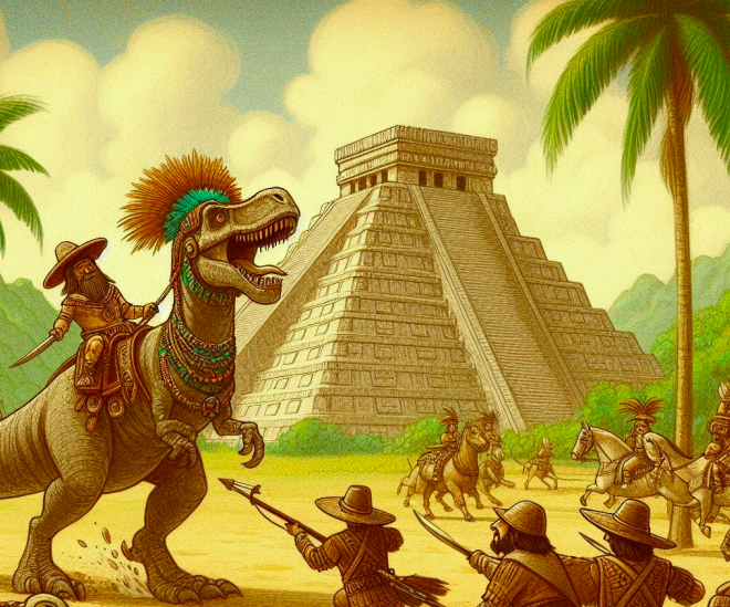 - Imatge 4: Un dinosaure en una escena d’indígenes contra soldats espanyols.
