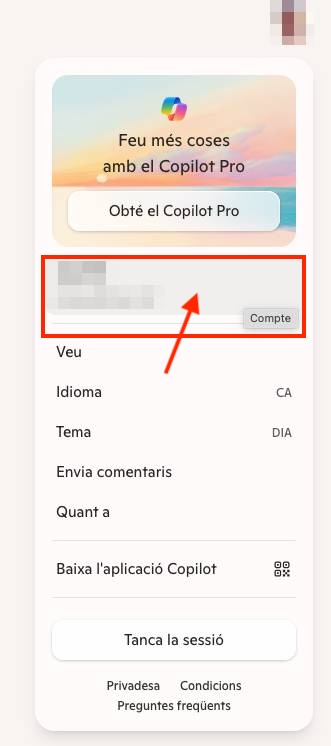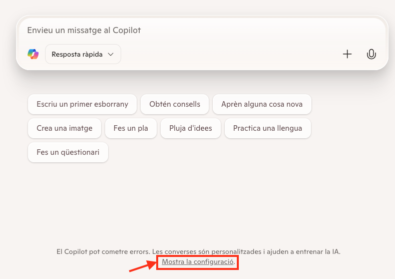👉 La configuració a Copilot està una mica amagada (juny 2025). Podeu trobar-la al compte, fent clic a l’usuari o, de vegades, apareix al peu.