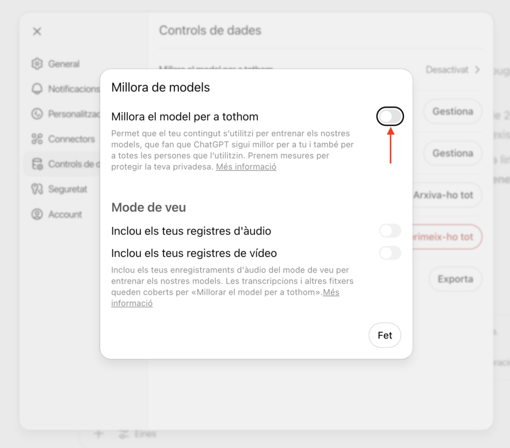 Per tant, en entorns educatius, es recomana desactivar l’entrenament de dades: