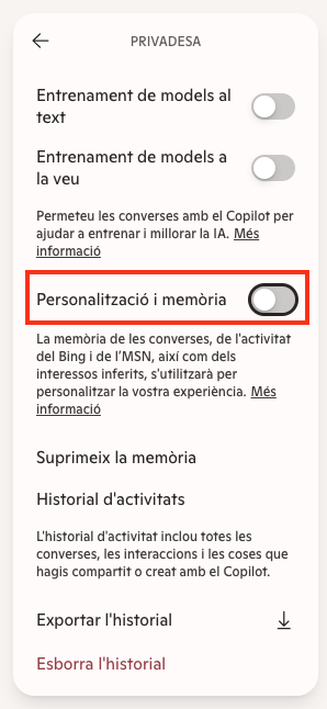 En Copilot aneu a la configuració i desactiveu Personalització i memòria. Podeu esborrar la memòria existent i l’historial d’activitat en les opcions corresponents.