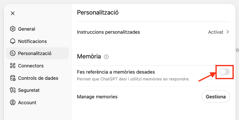 Cerqueu una opció Memòria, Activitat o similar dins del perfil de l’usuari o de la configuració general.