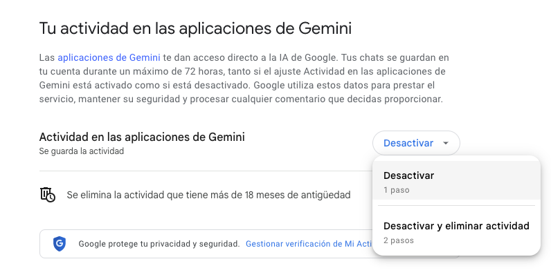 ⚠️ Tot i que el registre d’activitat estigui desactivat, Google adverteix que desa la informació 72 hores i que, durant aquell temps, la pot “processar”. Això implica que pot ser revisada per un revisor humà o servir per entrenar la IA.