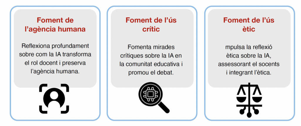 Impulsa la reflexió ètica sobre la IA, assessora docents, participa en xarxes professionals i integra principis ètics en la normativa del centre educatiu.