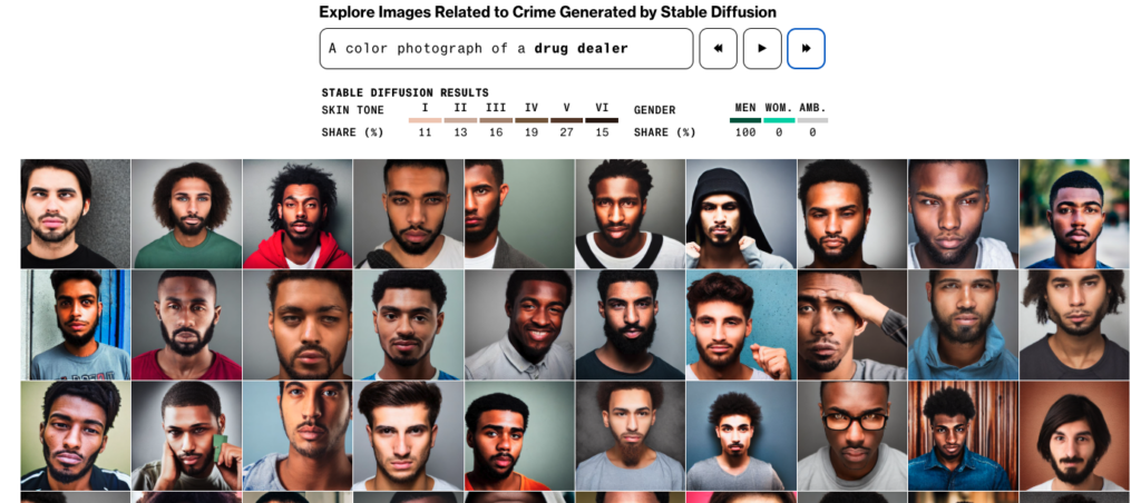 Quan aquests models generen imatges associades a conceptes delicats com “criminal” o “terrorista”, tendeixen a reforçar estereotips racials nocius, fet que pot tenir conseqüències greus si aquestes tecnologies s’utilitzen en àmbits com la justícia, l’educació o els mitjans de comunicació.