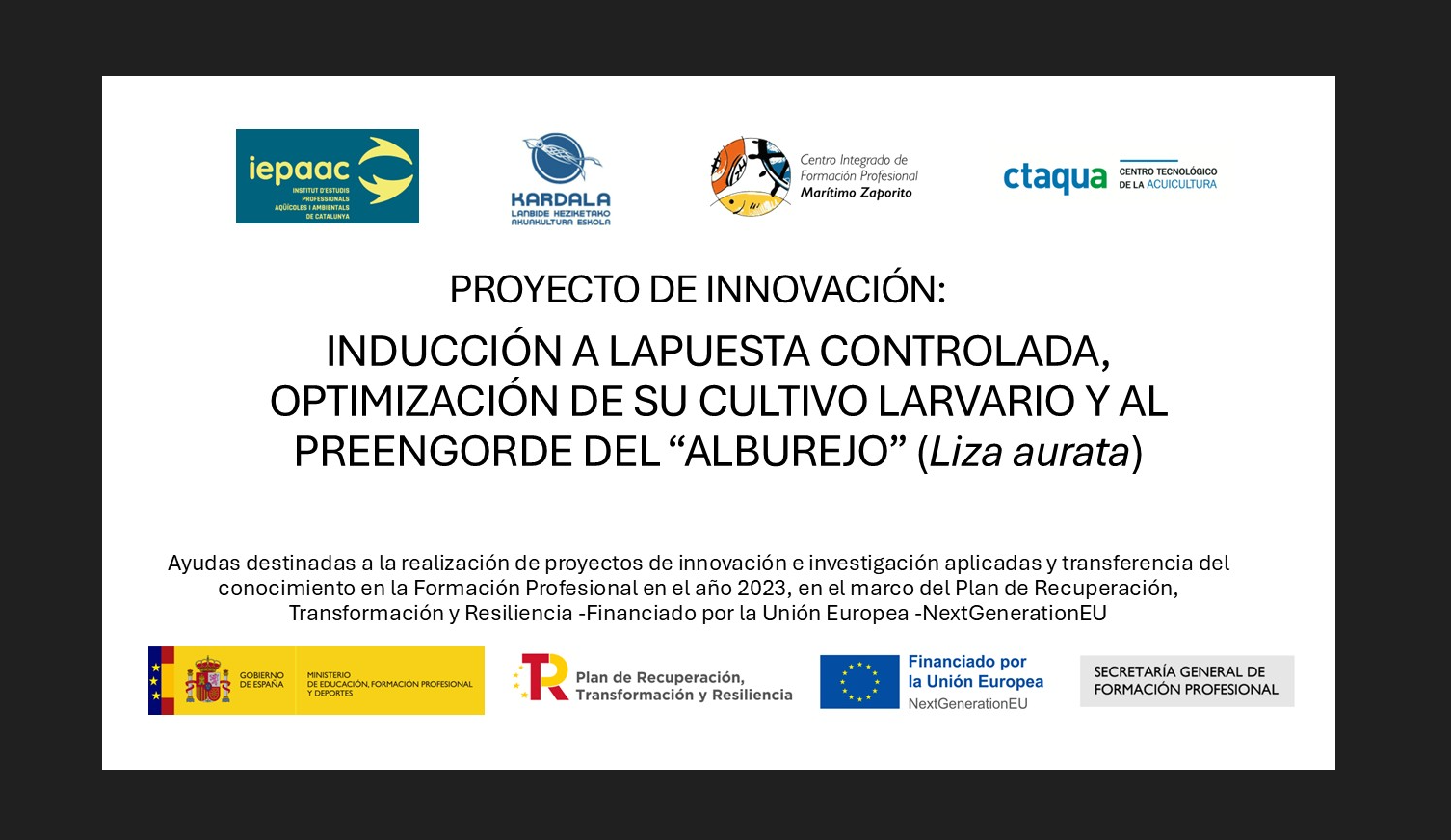 L’IEPAAC, juntament amb altres centres de formació professional com Zaporito (Andalusia) i Kardala (País Basc), i el centre de recerca Ctaqua, lideren un projecte innovador en aqüicultura sostenible: “Inducció a la posta controlada, optimització del seu cultiu larvari i pre-engreix de Liza aurata“. Aquesta iniciativa se centra en el cultiu de la llissa galta-roja, una espècie de peix amb un baix nivell tròfic i un alt valor nutritiu, que ofereix noves oportunitats per a l’aqüicultura mediterrània i promou una producció més sostenible, amb menor impacte sobre