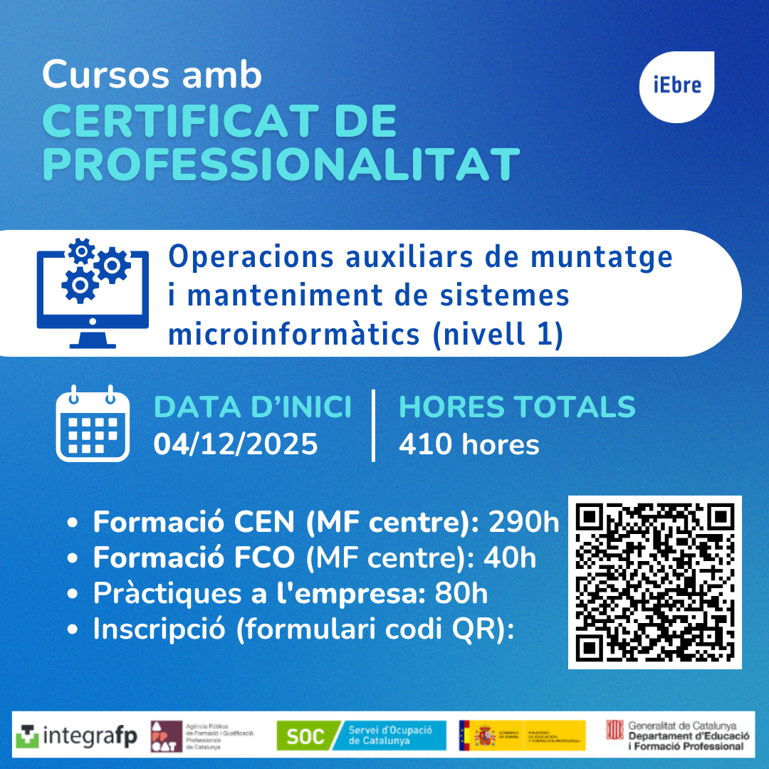 El passat mes de desembre es va iniciar a l’Institut de l’Ebre el Certificat de Professionalitat IFCT0108 Operacions auxiliars de muntatge i manteniment de sistemes microinformàtics (nivell 1), una formació que ofereix als participants una porta d’entrada al món laboral dins del sector de la informàtica.