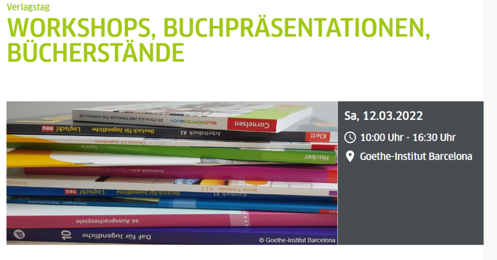 Tenim el plaer d’anunciar-vos que aquest curs escolar 2021-2022 Goethe Institut de Barcelona després de la pausa provocada per la COVID ha tornat a organitzar la nova edició de Jornada de tallers i presentacions de llibres per als docents d’alemany de manera presencial. La jornada tindrà lloc el dia 12 de març entre les 10h i 16.30h al Goethe Institut, Carrer Roger de Flor, 224.