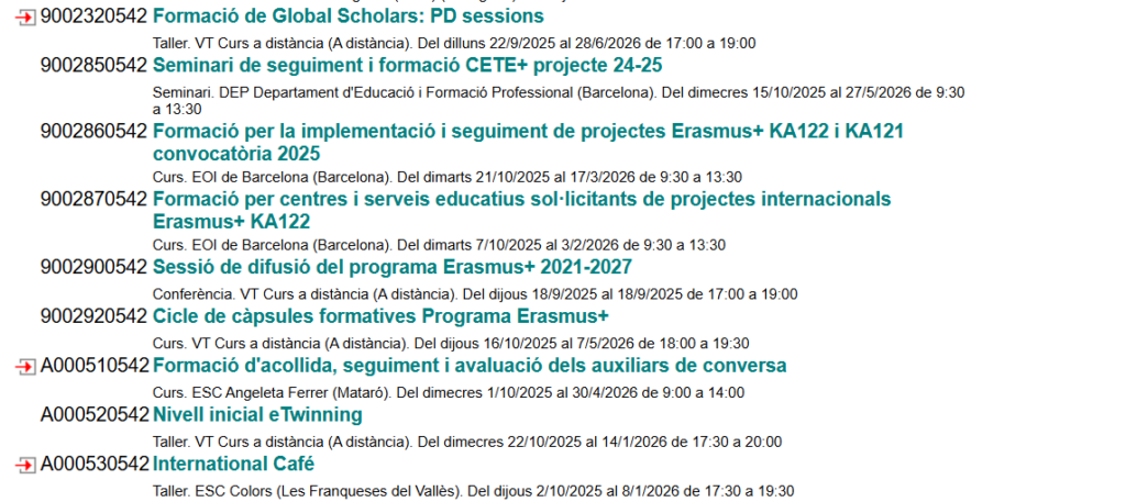 Anima’t i informa’t de les diferents activitats formatives que segur seran del teu interès i t’ajudaran a agafar idees, fer xarxa, resoldre dubtes i, en definitiva, iniciar-te o aprofundir la teva experiència en programes internacionals (Erasmus+, eTwinning, Global Scholars, Auxiliars de conversa).