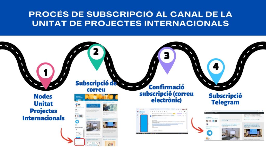 Des de la Unitat de Projectes Internacionals tenim l’opció d’informar-te, en temps real, de les notícies que anem publicant i que segur són del teu interès. Per poder rebre-les, només és necessari que et subscriguis al nostre canal, procés ràpid i àgil que consta dels següents passos:
