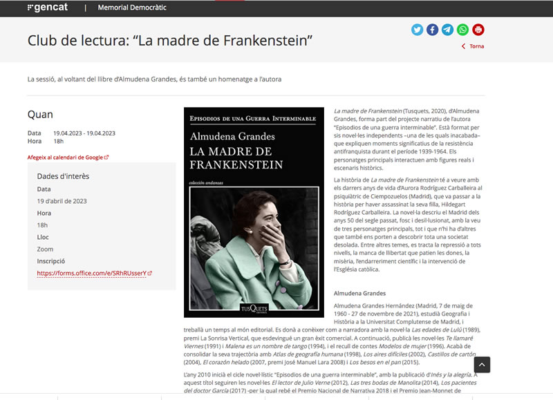 • Club de lectura DEMD: ‘La madre de Frankestein’ d’Almudena Grandes. 19 d’abril