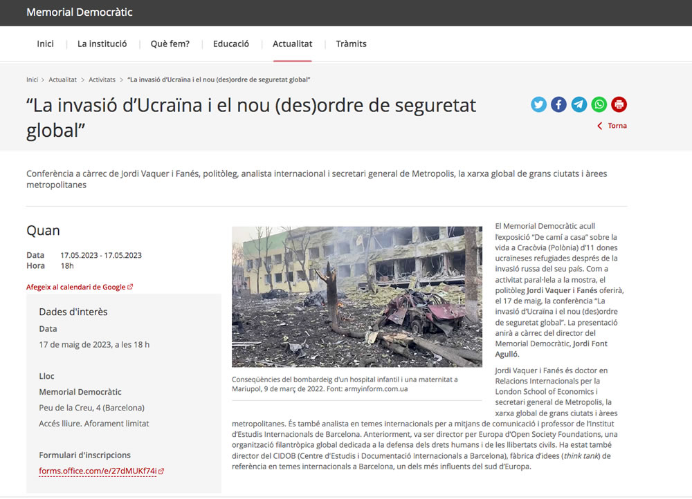 • Conferència “La invasió d’Ucraïna i el nou (des)ordre de seguretat global”. 17 de maig