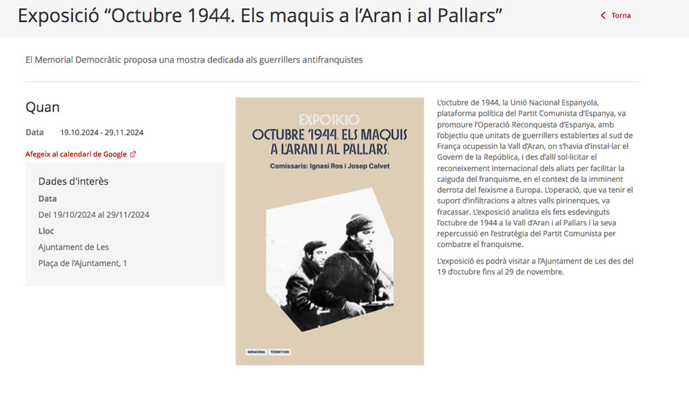 Exposició “Octubre 1944. El maquis a l’Aran i al Pallars”. Fins 29 de novembre