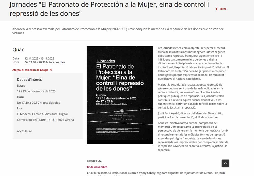 • Jornades “El Patronato de Protección a la Mujer, eina de control i repressió de les dones”. Girona. 12 i 13 de novembre
