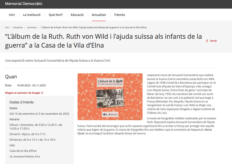 • “L’àlbum de la Ruth. Ruth von Wild i l’ajuda suïssa als infants de la guerra” a la Casa de la Vila d’Elna. Del 16 de setembre al 3 de novembre