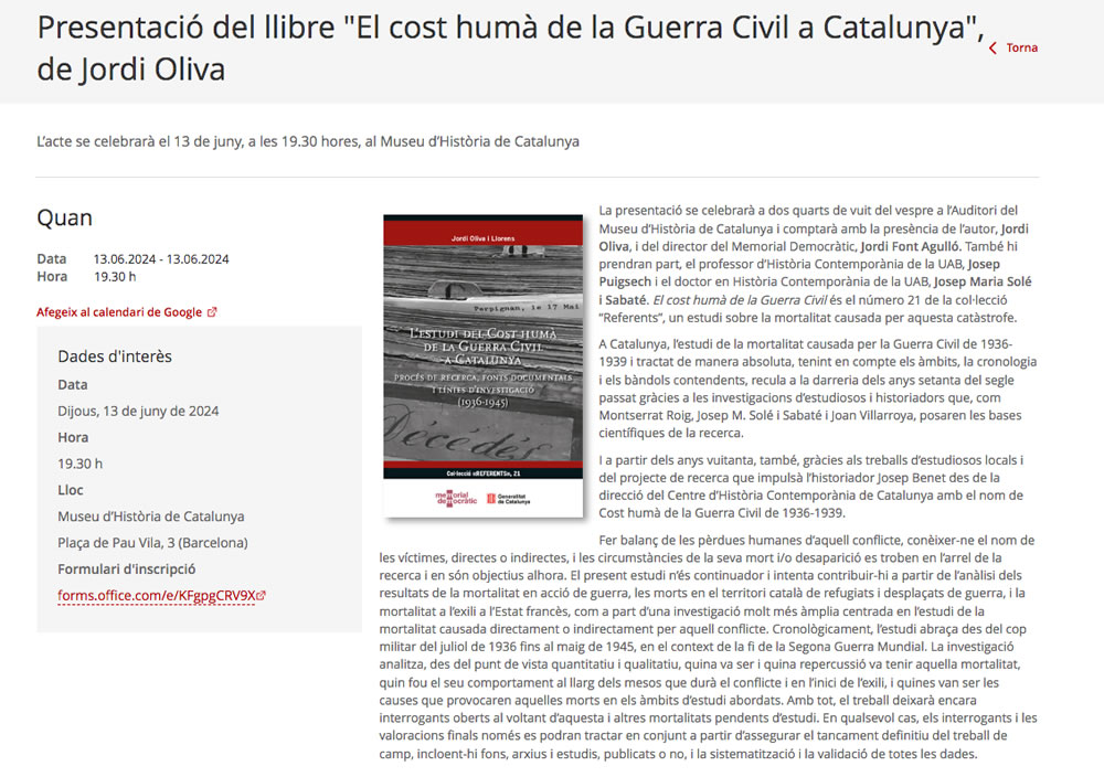 Presentació del llibre “El cost humà de la Guerra Civil a Catalunya”. 13 de juny