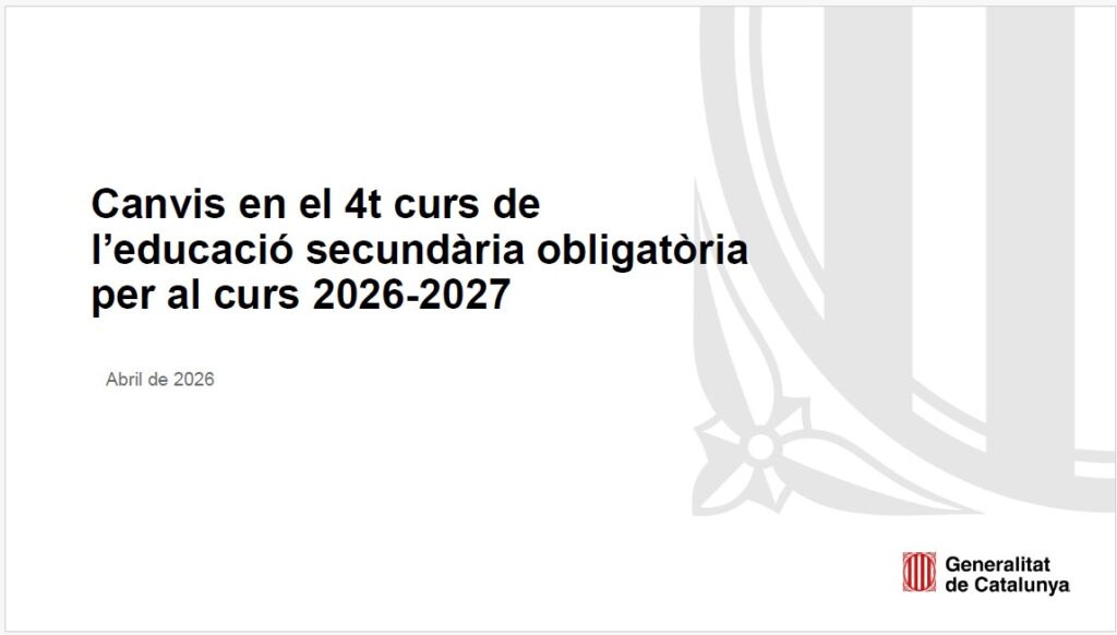 El Departament d’Educació i Formació Professional ha publicat una presentació per informar les direccions dels centres dels canvis que cal introduir en el 4t curs de l’ESO el pròxim curs 2026-2027.