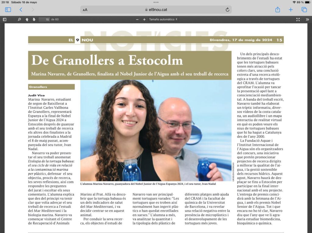 Una investigació sobre l’impacte del plàstic marí en la tortuga bova és la guanyadora del Stockholm Junior Water Prize Spain 2024. El treball de Marina Navarro, alumna de 2n de Batxillerat en l’Institut Carles Vallbona de Granollers, és seleccionat per representar a Espanya en la final internacional del ‘Nobel júnior de l’aigua’.