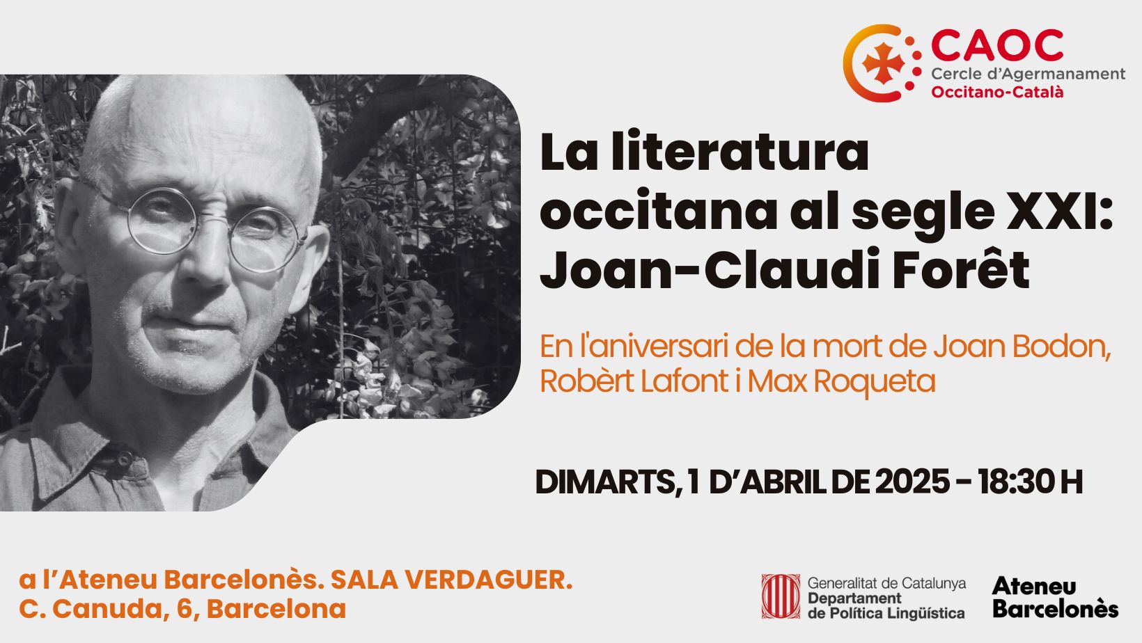 DIMARTS, 1 D’ABRIL DE 2025: Conferència “La literatura occitana al segle XXI: Joan-Claudi Forêt”. 18:30 h. Ateneu Barcelonès. Sala Verdaguer. Carrer de la Canuda, 6. Barcelona. Entrada lliure