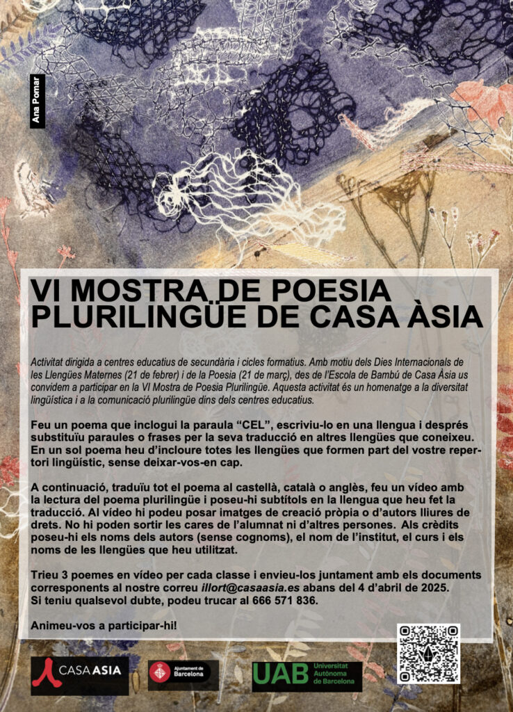 La mostra s’emmarca en la celebració del Dia Internacional de les Llengües Maternes (21 de febrer) i s’estendrà fins al 4 d’abril. Els centres interessats poden trobar més informació al cartell oficial de la convocatòria, que inclou exemples de cursos anteriors accessibles mitjançant un codi QR. Casa Àsia espera amb entusiasme les vostres aportacions poètiques per celebrar junts la diversitat lingüística i cultural.