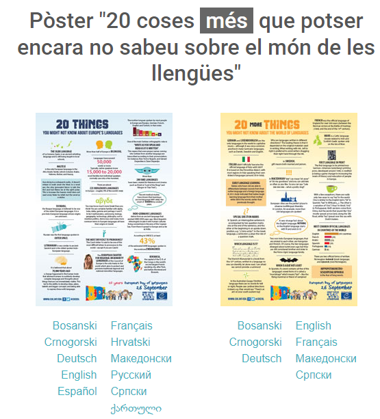 Els 46 estats membres del Consell d’Europa animen més de 700 milions d’europeus a aprendre més llengües a qualsevol edat, dins i fora de l’escola. Per promoure aquest plurilingüisme, us animem a treballar les llengües europees amb les següents propostes extretes del web Dia Europeu de les Llengües: