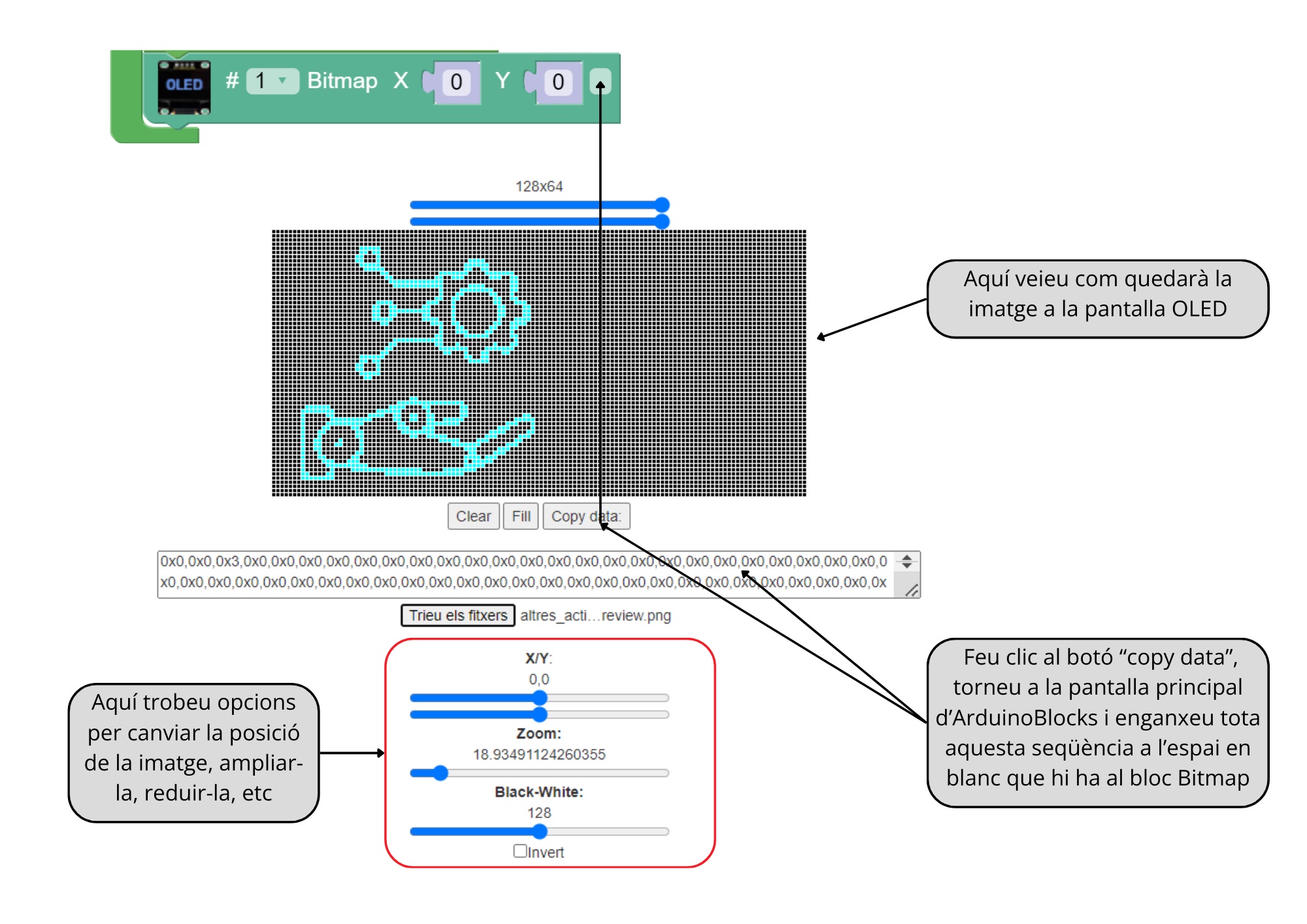 6. Ara, afegiu una espera de 2 segons (2000 mil·lisegons), feu que es netegi la pantalla i que a continuació es mostri una imatge. Per afegir l’espera de 2 segons, aneu a la categoria “Temps” i escolliu el bloc “Esperar 1000 mil·lisegons”. Canvieu el valor a 2000. A continuació, de la categoria Visualització/Pantalla OLED, escolliu el bloc “OLED #1 Bitmap…”. Obriu l’OLED – Bitmap Editor: