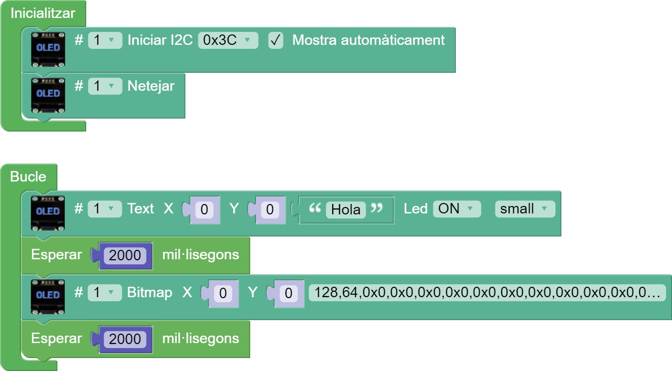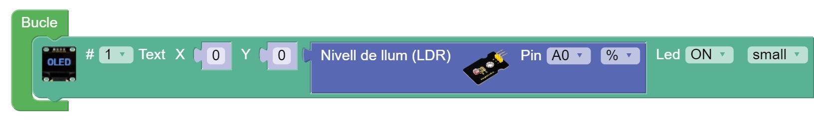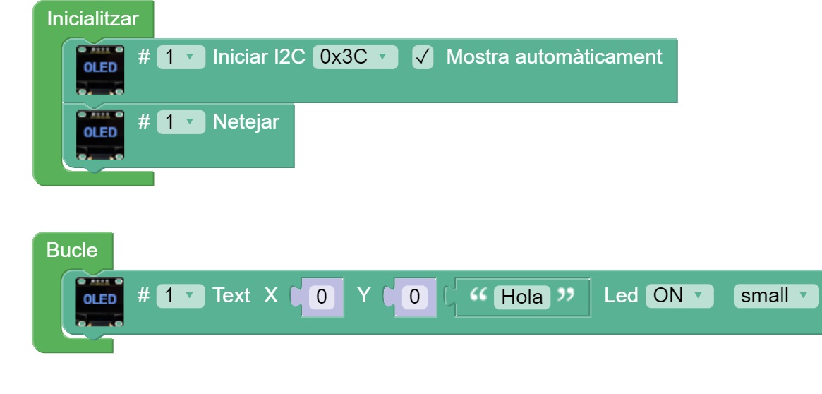 5. A continuació, al bloc “Bucle”, situeu-hi algun dels blocs de visualització de la pantalla OLED, en funció del que vulgueu mostrar. Comenceu mostrant el text “Hola”, amb el bloc “OLED #1 Text…”: