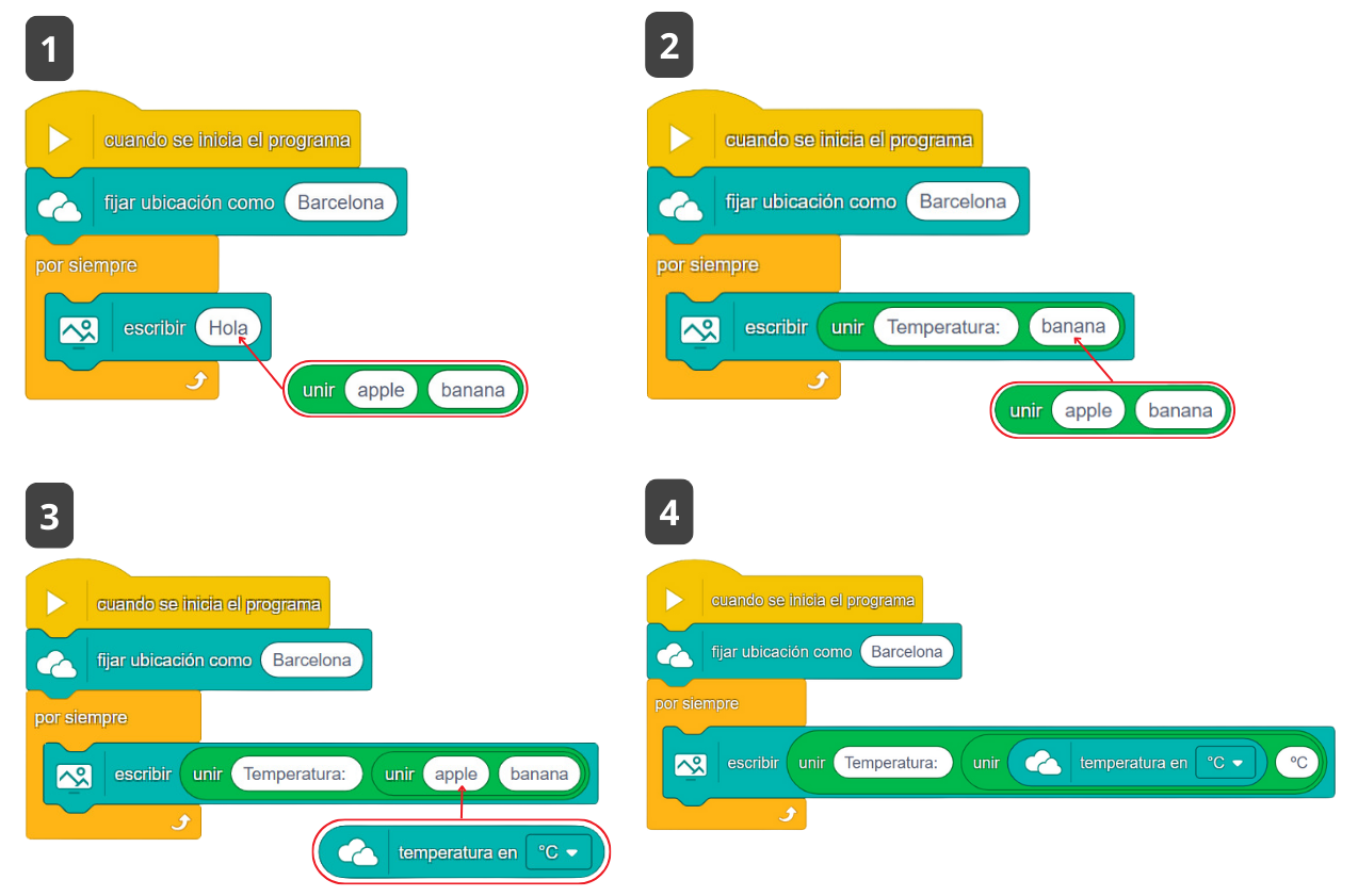 En els blocs de color taronja cal seleccionar la població més propera al vostre centre educatiu (entre les disponibles en el núvol mBlock).