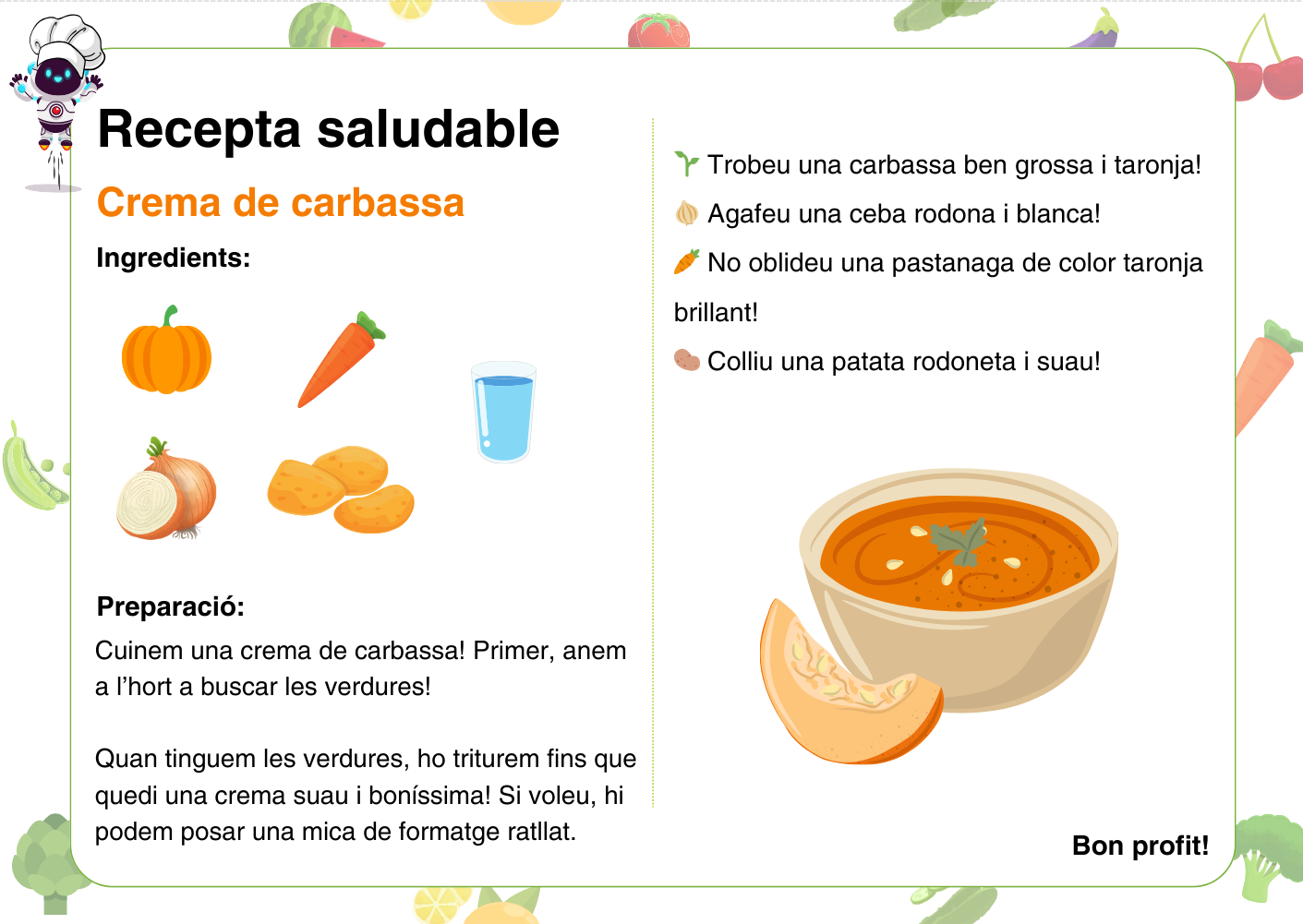 A l’exemple que teniu a continuació, volem preparar una crema de pastanagues. Per fer-la, necessitarem:
