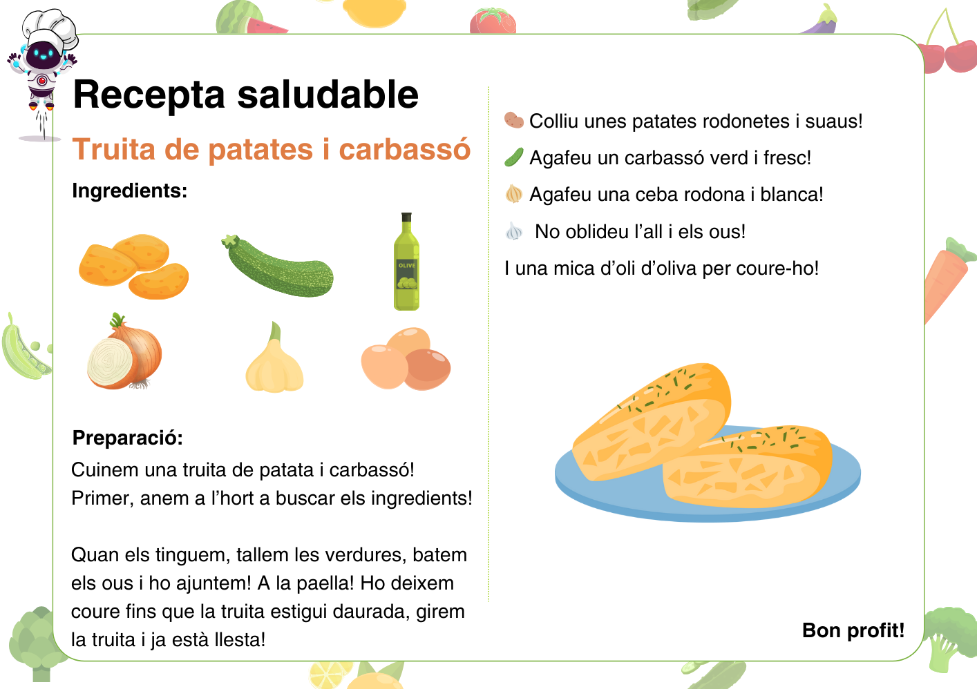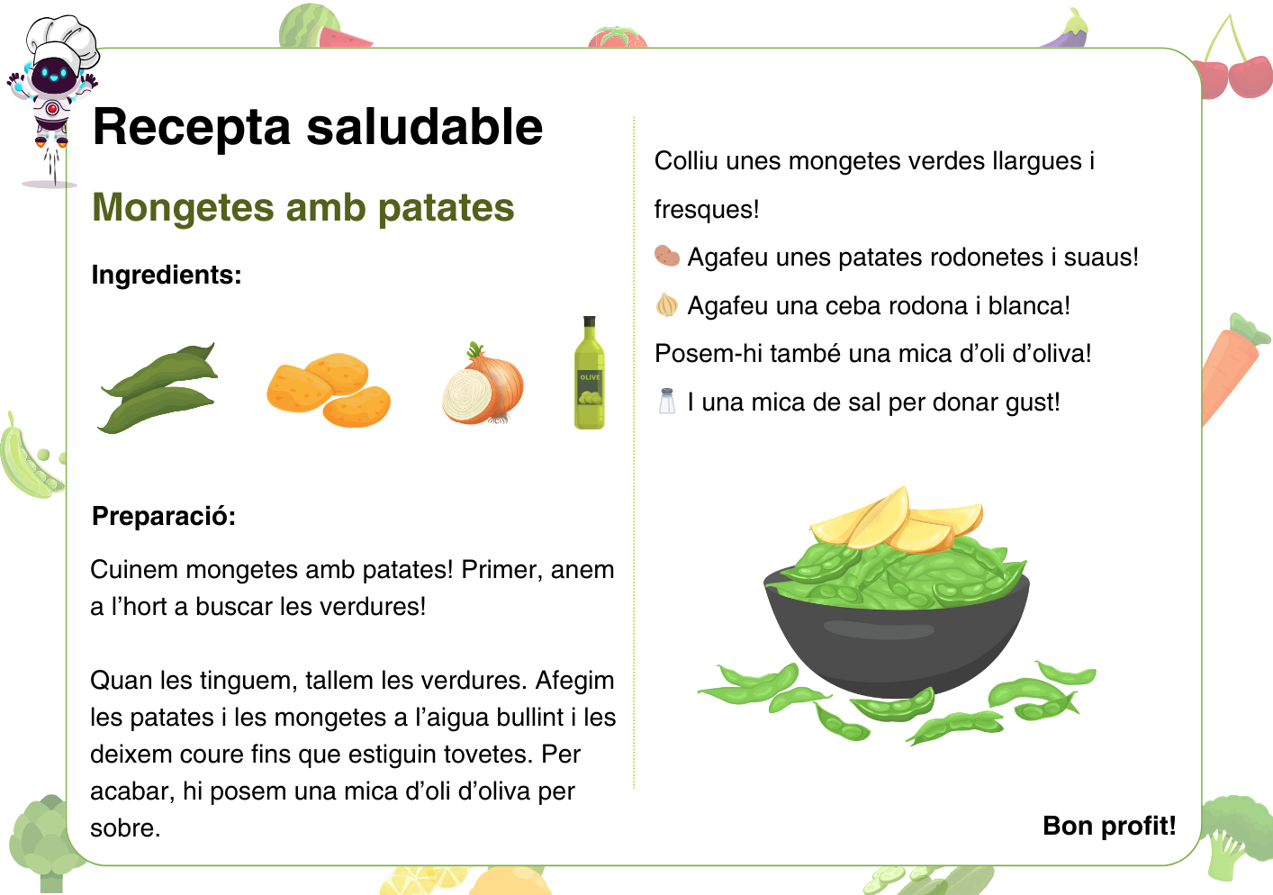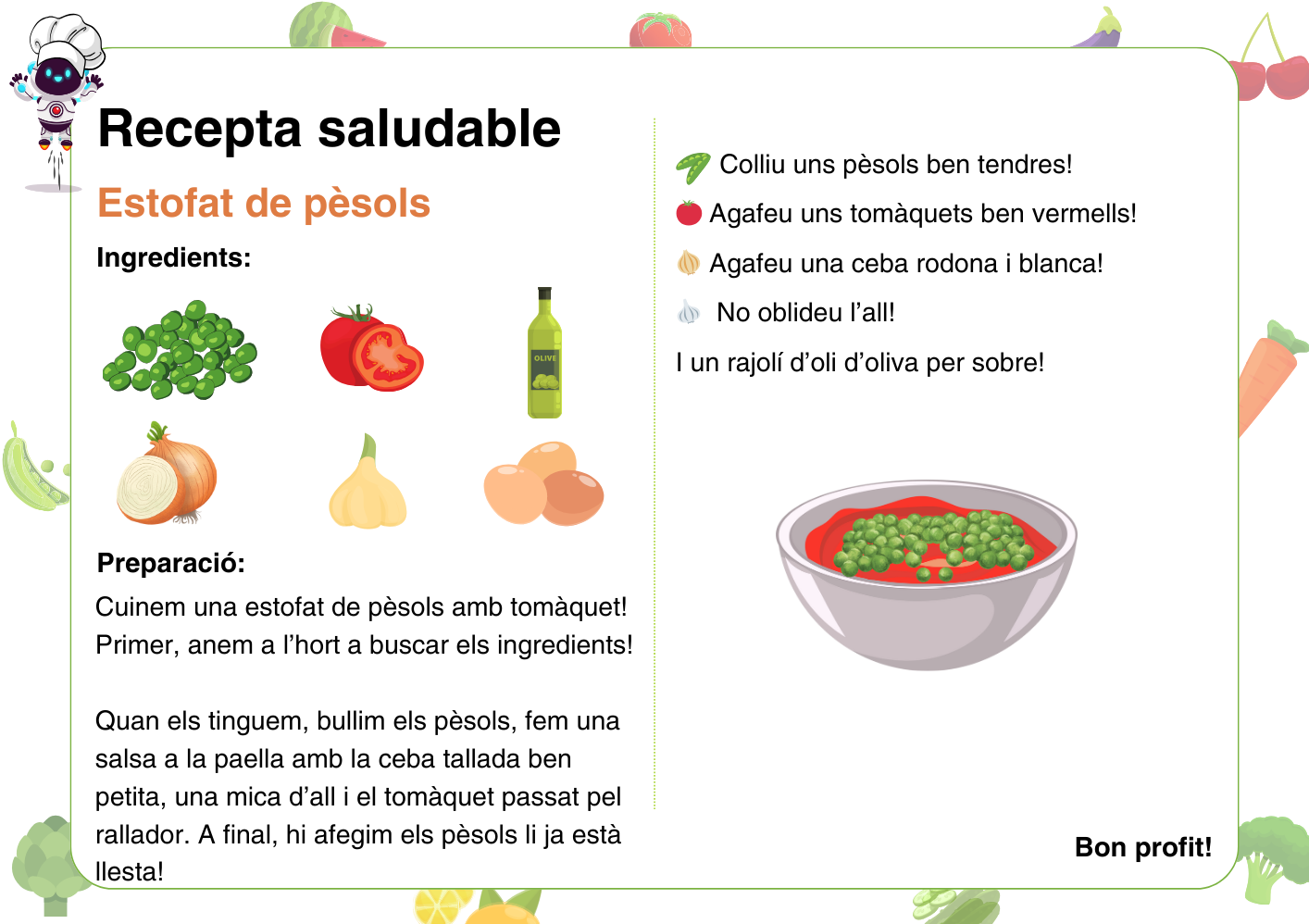 Us oferim 4 receptes diferents per poder fer recorreguts amb el robot i també una plantilla buida perquè pugueu fer les vostres pròpies receptes, ja que algunes de les hortalisses no surten a les 4 receptes que us donem: