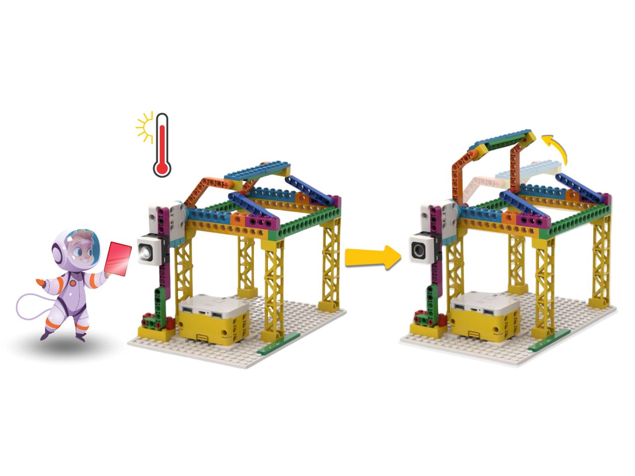 Haureu comprovat que el LEGO Spike Essential no té sensor de temperatura. Tot i així, a l’entorn de programació de LEGO SPIKE podeu trobar blocs per treballar amb dades de la previsió meteorològica de la vostra ubicació. En aquest repte, us demanem que construïu un hivernacle que tingui alguna part mòbil que permeti que es pugui ventilar quan la temperatura sigui massa alta.
