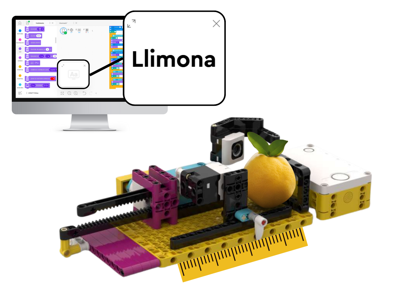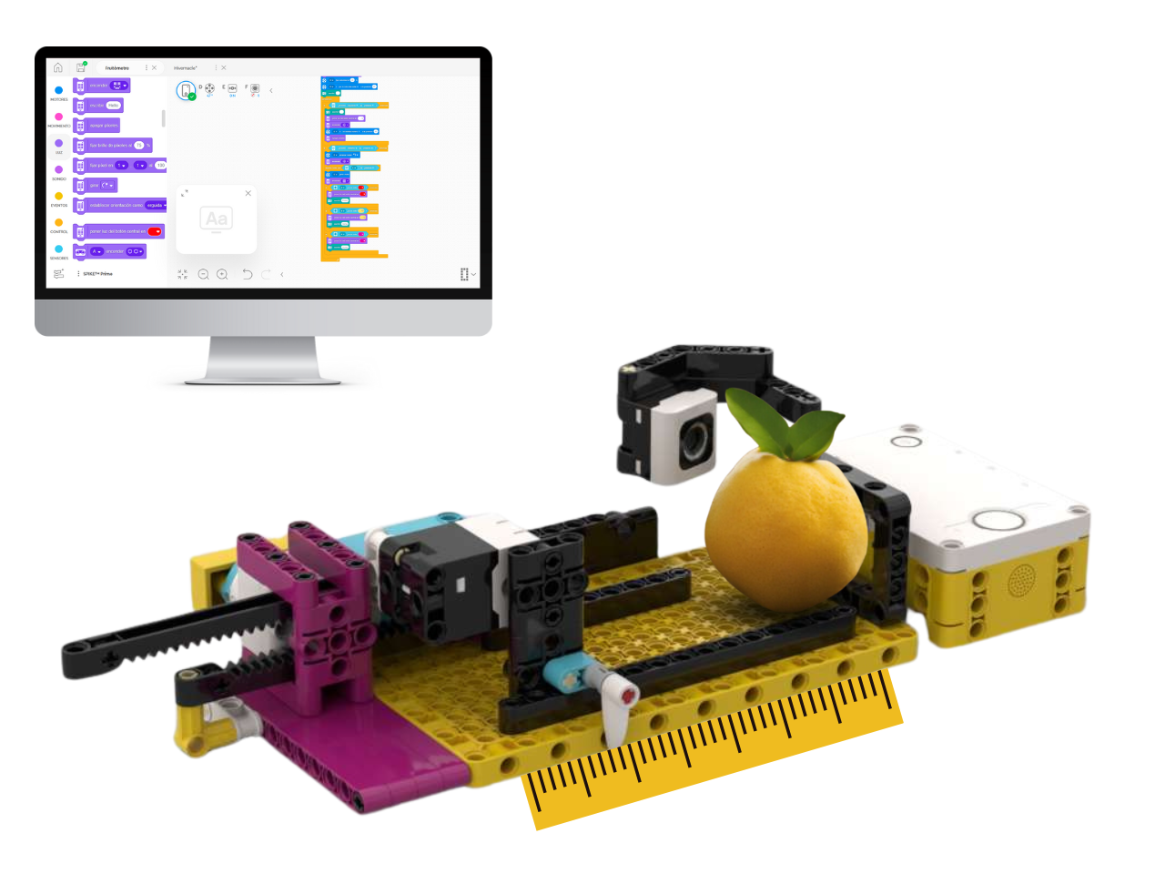 Haureu comprovat que el LEGO Spike Prime no té sensor de temperatura. Tot i així, a l’entorn de programació de LEGO SPIKE podeu trobar blocs per treballar amb dades de la previsió meteorològica de la vostra ubicació. En aquest repte, us demanem que construïu un dispositiu, que hem anomenat fruitòmetre, que sigui capaç de mesurar la mida d’una fruita xeldoniana i determinar quina fruita és a partir del seu color.