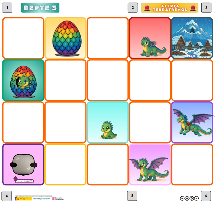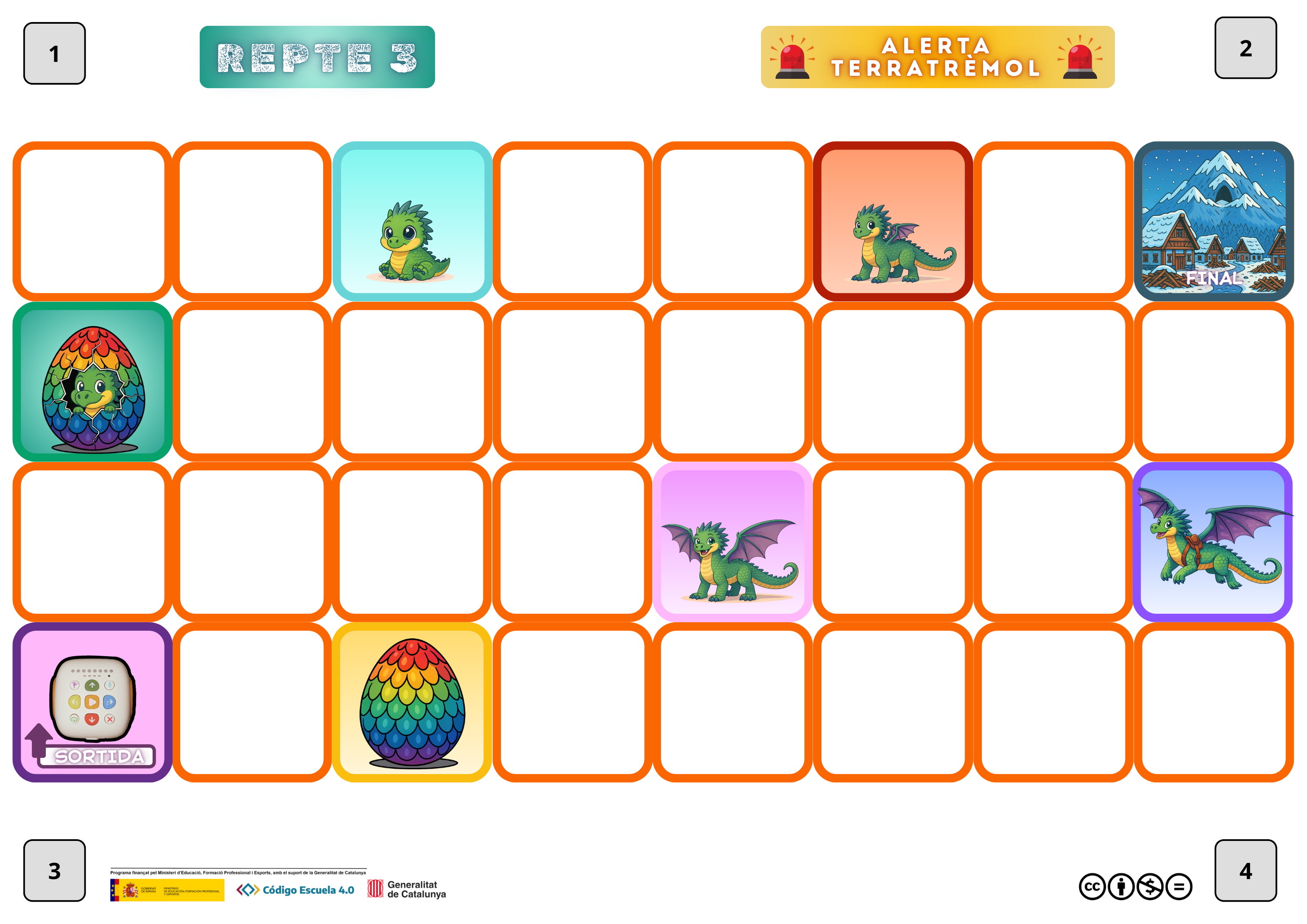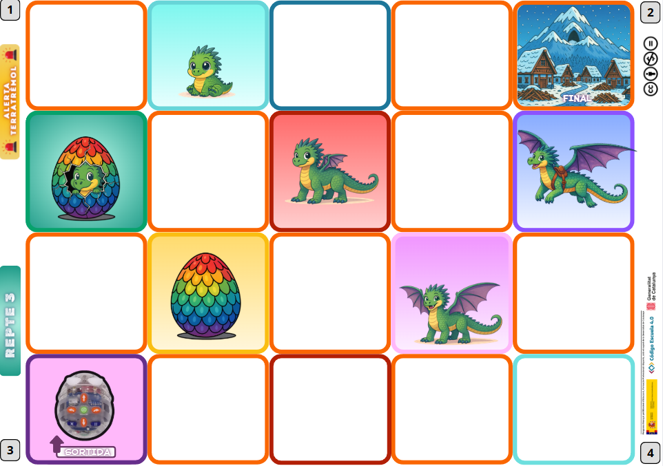 En aquest repte, haureu d’aconseguir ordenar les etapes de creixement del drac utilitzant les targetes numerades i guiar el robot pel tapís seguint la seqüència correcta. Esteu preparats?