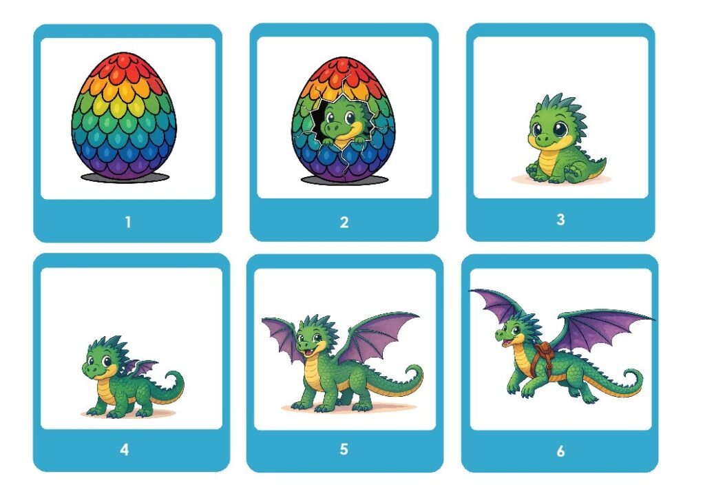 L’objectiu d’aquesta primera activitat és que els alumnes expliquin oralment la seqüència del creixement del drac. Per facilitar-ho, teniu un conjunt de targetes que representen diferents moments del creixement. Cal que imprimiu les targetes i repartiu a cada grup totes les targetes i fer que les ordenin en ordre cronològic.
