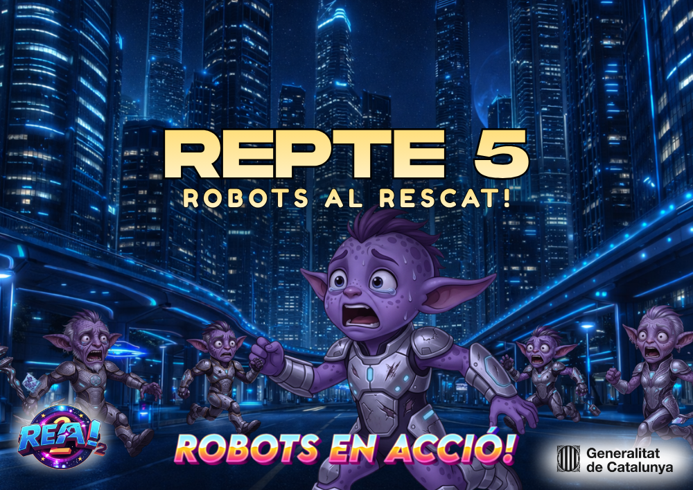 Repte 5: Robots al rescat Conte Descarrega el conte en PDF Còmic Descarrega el còmic en PDF Trieu el tipus de robot: Robots amb polsadors Robots compactes Plaques programables