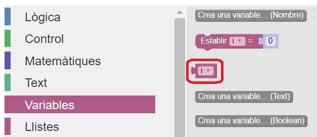 4. Per omplir el buit on va el número del led, aneu a la Categoria “Variables”; hi trobareu la variable “i”.