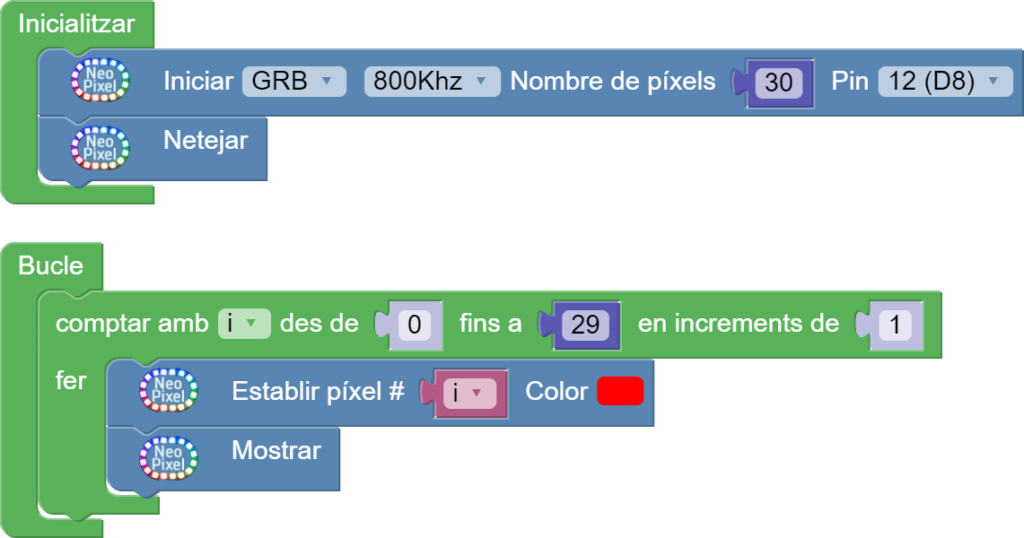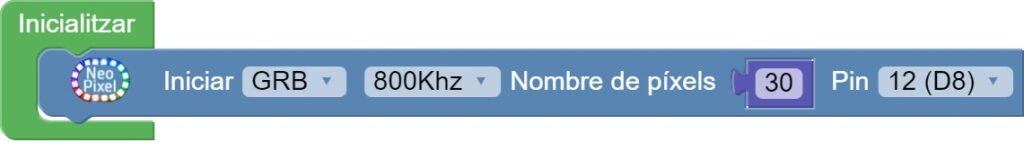 4. La tira de leds cal inicialitzar-la. Per fer-ho, aneu a la categoria “Visualització / NeoPixel” i col·loqueu el bloc “Iniciar GRB 800Khz…”. A continuació, canvieu el nombre de píxels a 30, que són els que tenen les tires de leds dels conjunts i seleccioneu el pin on tingueu connectada la tira
