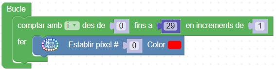 3. Canvieu el valor 9 per 29, per tal que la variable “i” consideri des del led 0 (primer led de la tira) fins al led 29 (últim led de la tira). A continuació, de la categoria “Visualització / NeoPixel”, poseu un bloc “Establir píxel #…”.