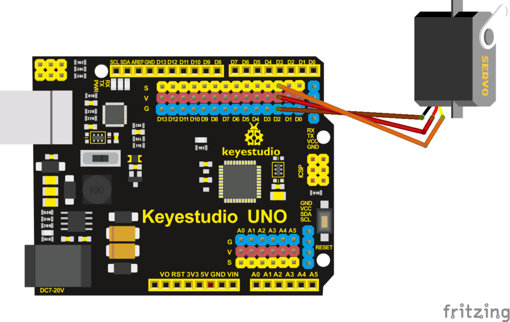 3. Connecteu el servomotor a algun dels pins digital de la placa (a l’exemple utilitzarem el pin D2), tenint en compte que el cable marró del servomotor correspon a la G -terra- (color blau de la placa), el cable vermell del servomotor correspon a la V -voltatge- (color vermell de la placa) i el cable taronja del servomotor correspon a l’S -senyal- (color groc de la placa)