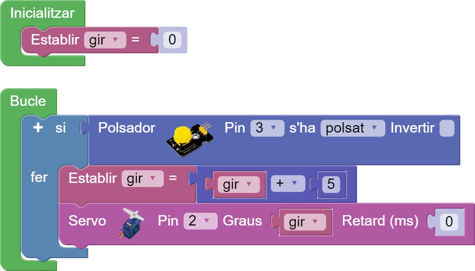 8. Des de la categoria “Variables”, creeu una variable del tipus nombre (a l’exemple l’anomenem “gir”). A continuació, situeu el bloc “Establir gir=0” dins del bloc “Inicialitzar”, d’aquesta manera, el valor inicial de la variable serà 0. Poseu un bloc de la categoria “Lògica” “Si…fer” al bloc “Bucle”. A continuació del “si”, col·loqueu el bloc “Polsador” que trobareu a la categoria “Sensors” i trieu el pin on el tingueu connectat (a l’exemple, el pin 3). A continuació del “fer” actualitzareu el valor de la variable “gir”, sumant-li 5º. Per fer-ho, de la categoria “Variables”, escolliu el bloc “Establir gir” i a continuació, de la categoria “Matemàtiques” trieu un bloc de suma i a dins poseu-hi la variable “gir” més 5. Per últim, feu que el servomotor giri segons el valor d’aquesta variable, tal com es mostra a la imatge: