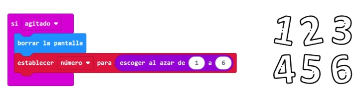 1. Comenceu creant el dau numèric. Per fer-ho, feu que en sacsejar la micro:bit es mostri un número aleatori de l’1 al 6 a la pantalla de leds.