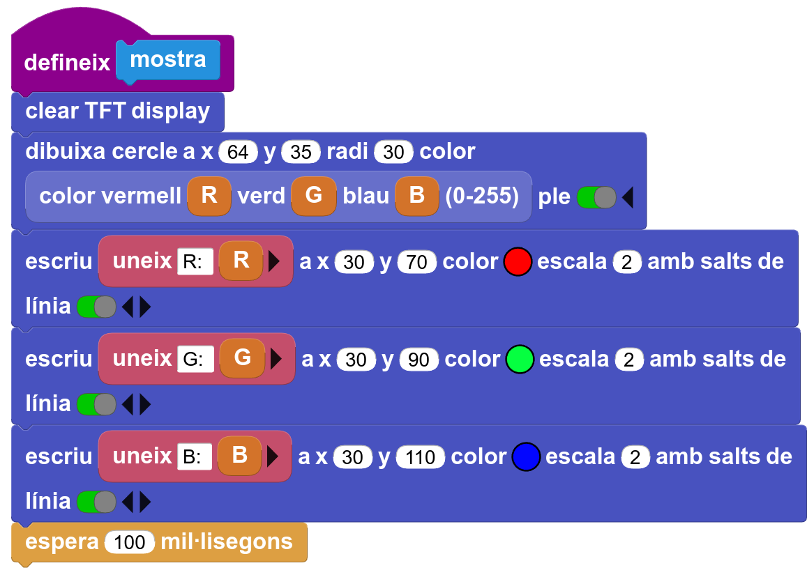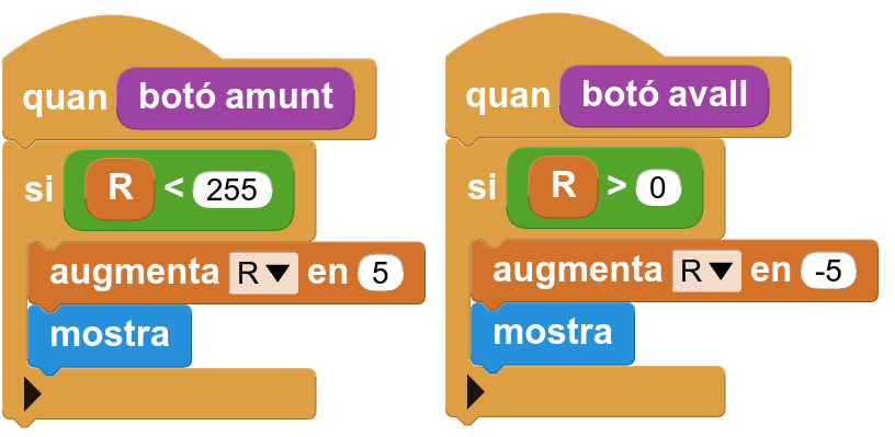 10. Per canviar el valor de la intensitat R (vermell) utilitzeu 2 botons (“amunt” i “avall”, per exemple). A cada toc augmenteu o disminuïu el valor, però impedint que pugi per sobre del valor màxim (255) o baixi per sota del valor mínim (0). És convenient sumar o restar 5 en comptes d’1 per tal que els canvis a cada toc siguin més visibles. Un cop canviat el valor, crideu el procediment “mostra”: