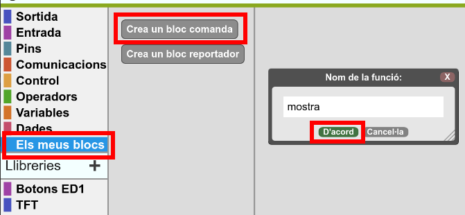7. La pantalla s’actualitzarà cada cop que l’usuari premi algun botó per canviar el valor de R, G o B. Caldran 6 botons (3 per augmentar el valor i 3 per disminuir-lo), i dins de cada bloc de botó hi haurà els blocs per actualitzar la pantalla. En casos com aquest, en què s’hauria de repetir una mateixa seqüència de blocs, és convenient definir un procediment. Un procediment es crea a l’apartat “Els meus blocs” prement el botó “Crea un bloc comanda”. A continuació, s’ha d’escriure el nom del procediment (escriviu “mostra”):