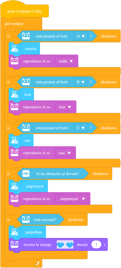 3. Programeu el robot perquè mostri emocions concretes. Utilitzeu un bucle “per sempre” i condicionals per a cada tecla o sensor del robot.