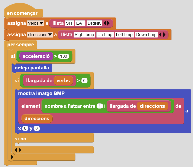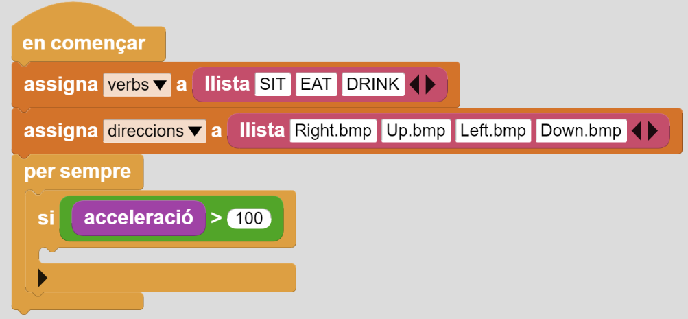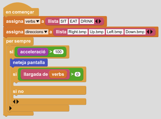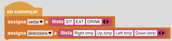 3. Creeu 3 variables: verb, verbs i direccions. Des de la categoria Control afegiu “en començar” i “assigna verbs a” + bloc de Dades “llista SIT, EAT, DRINK” (o tants verbs com es desitgi). Afegiu també un altre “assigna direccions a” + bloc de Dades “llista Right.bmp, Up.bmp, Left.bmp, Down.bmp”: