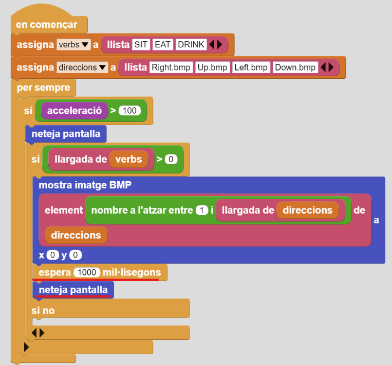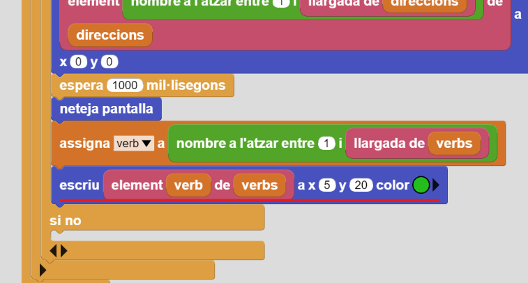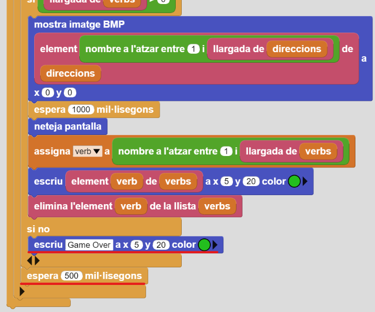 11. Quan l’alumnat hagi acabat el llistat de verbs podeu afegir un bloc per fer saber que s’ha acabat l’activitat. A l’encaix del condicional que queda buit, afegiu el bloc “escriu…” de TFT i escriviu el text “Game Over” a x=5 y=20 (color verd). Poseu també un bloc d’espera “500 mil·lisegons” des de Control entre el primer i el segon condicional: